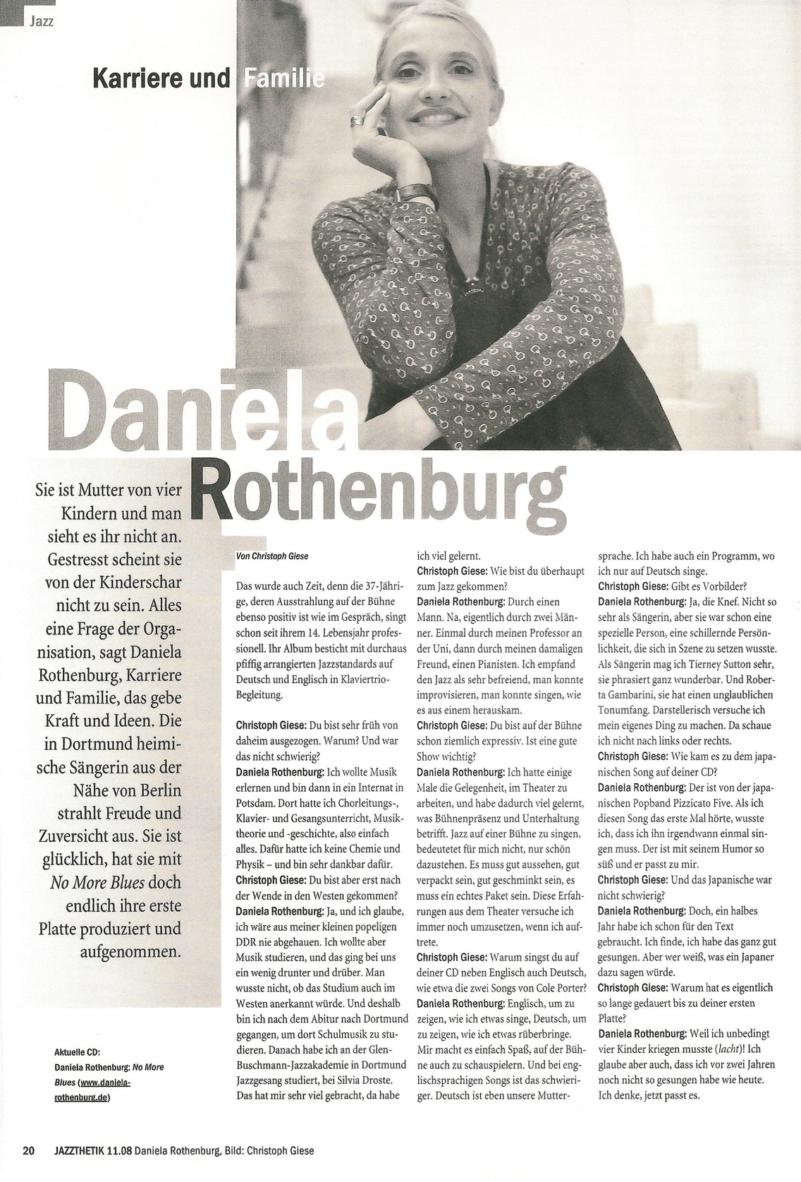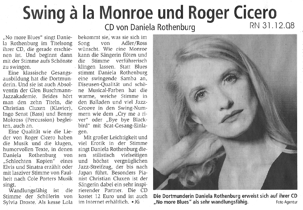 "Daniela Rothenburg, eine junge, tolle Sängerin für anspruchsvolle Swing-Musik, mit Ausflügen in die jazzig-musikalischen Sphären von Hildegard Knef (...)"