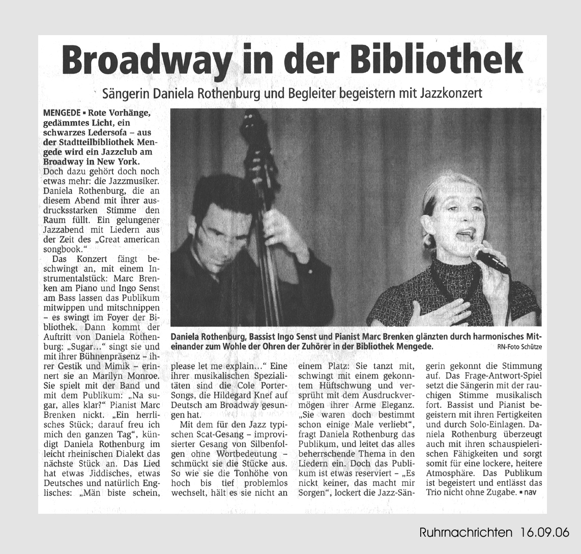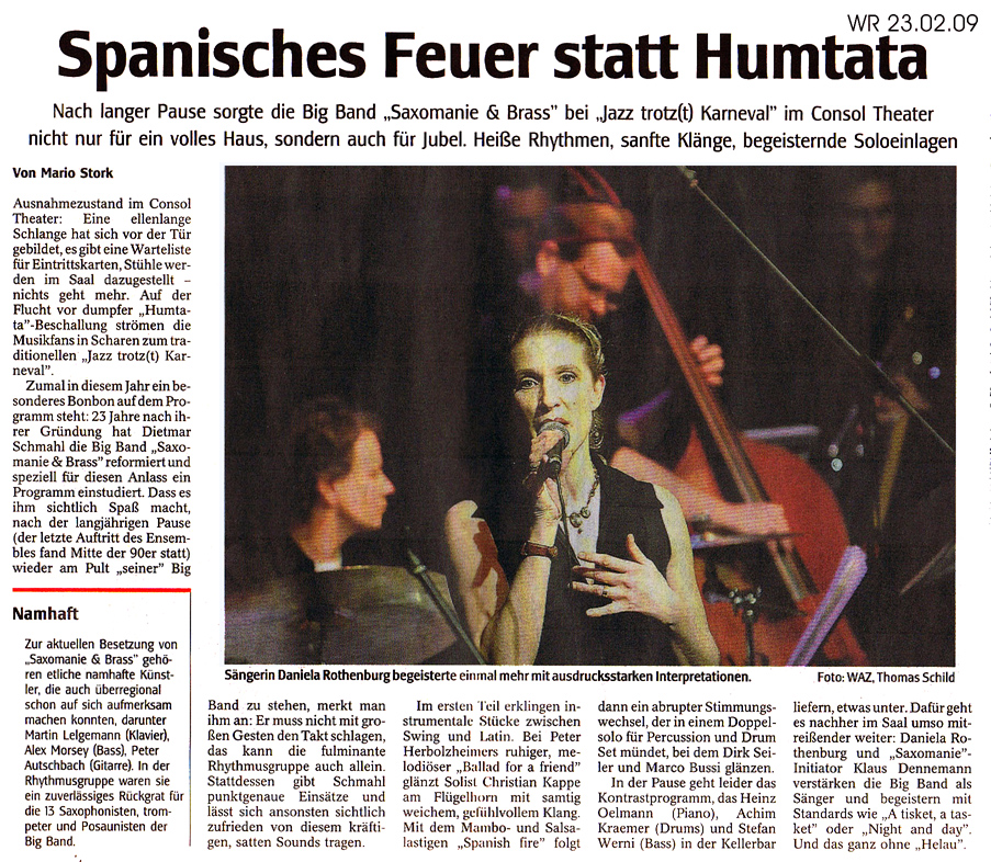 "Besonders positiv fiel die im zweiten Teil des Auftrittes mitwirkende Sängerin Daniela Rothenburg auf, die bei George Gershwins "Summertime", Ella Fitzgeralds "A Tisket a Tasket" und Duke Ellingtons "It don´t mean a thing", brillierte."