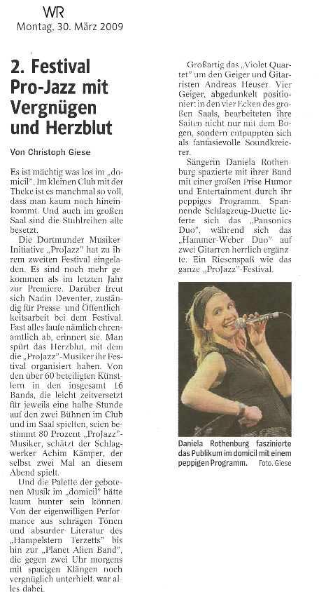 Eine in Positionen hochkarätig besetzte NRW-all-star-Band feat. Daniela Rothenburg. Die grazile Silvia Droste-Schülerin aus Dortmund hat das Zeug dazu, eine ganz Große zu werden. (...) die Vocalistin, die mit enormem Stimmvolumen überraschte - bei der grazilen Figur. Die einstige Schülerin "unserer" Jazzlady Silvia Droste begann ihre Karriere in der ehemaligen DDR und absolvierte das Studium an der "Glen Buschmann-Jazzakademie". Die vielseitige Musikerin tourt vornehmlich mit NRW-Bands durch die Lande (...)"